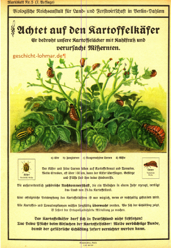 Was machen Sie dienstags ab 13:00 Uhr in den Monaten Mai bis August? Vor ca. 90 Jahren wäre die Antwort klar gewesen, auf den umliegenden Feldern arbeiten, um den Kartoffelkäfer zu bekämpfen. Seine Bekämpfung hatte nicht nur in Kriegszeiten höchste Priorität, da die Kartoffel das wichtigste Grundnahrungsmittel war und zudem einfach eingelagert werden konnte.